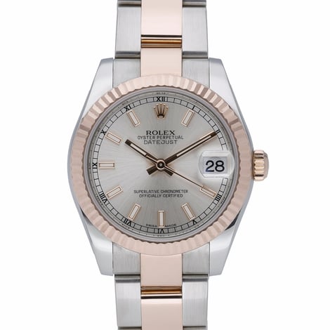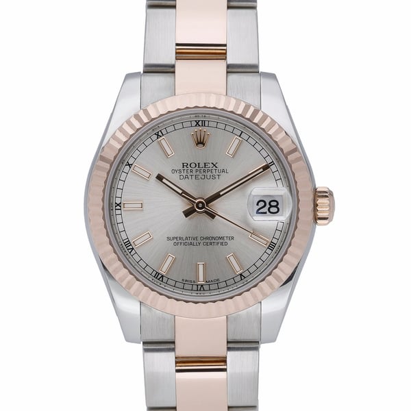 Rolex Datejust 31 (ref. 178271), 2018, in excellent condition. This midsize 31mm model pairs a steel and rose gold (Rolesor) case with a classic fluted bezel and a matching steel and rose gold bracelet featuring a concealed clasp. The silver baton dial sits beneath durable sapphire crystal, powered by a precise automatic movement and water resistant to 100M. Supplied complete with original box, original papers, and white tag, this example is an ideal blend of everyday versatility and timeless elegance. Offered with a 2-year warranty, 14-day return policy, and next day delivery for your convenience. BQ Ref: 51679.
