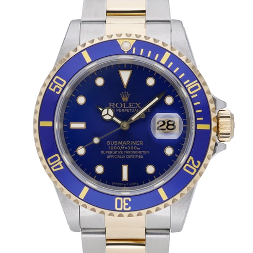 Rolex Submariner 16613 (1993), BQ Ref 51684, in excellent condition. This iconic 40mm two-tone model pairs a steel and yellow gold case with a matching Oyster bracelet and secure Oysterlock clasp. The rich blue dial sits beneath a scratch‑resistant sapphire crystal, framed by a unidirectional rotating bezel for precise timing. Powered by a reliable automatic movement and water resistant to 300M, it’s built for performance and everyday wear. Supplied with Rolex box and original green tag. Includes our 2 Year Warranty, 14 Day Return Policy, and Next Day Delivery.