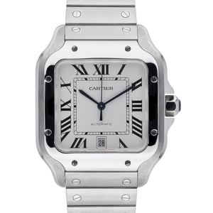 Cartier Santos de Cartier WSSA0018 (2024) in excellent condition. This gents model features a 39mm stainless steel case with a plain bezel, a crisp white Roman dial protected by sapphire crystal, and a matching steel bracelet secured by a folding clasp. Powered by an automatic movement and water resistant to 100M, it balances everyday versatility with refined design. Supplied complete with original Cartier box and papers, and backed by a 2 Year Warranty. BQ Ref: 51730. Next Day Delivery available and covered by our 14 Day Return Policy.