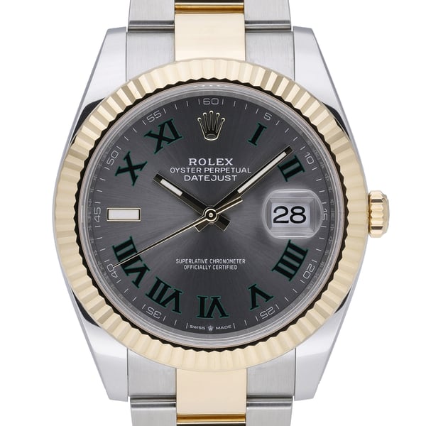 Rolex Datejust 41, model 126333, pairs steel and yellow gold in a 41mm case with a signature fluted bezel and a slate Roman dial beneath sapphire crystal. Powered by an automatic movement, this 2025 example is in excellent condition and water resistant to 100M. It features the two-tone Oyster bracelet with Oysterclasp for secure, comfortable wear. Supplied complete with Rolex box, original papers, and white tag. Covered by a 5-year manufacturer’s warranty from its 2025 date of manufacture. BQ Ref 51714. Next day delivery available with a 14-day return policy.