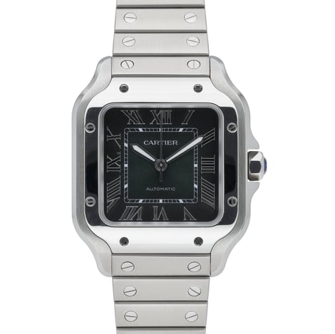 Introducing the Cartier Santos (WSSA0061), crafted in 2025 and presented in excellent condition. The 35mm stainless steel case with smooth bezel houses an automatic movement and a striking green Roman dial beneath sapphire crystal. A robust steel bracelet with folding clasp ensures comfort and security, while 100M water resistance enhances everyday versatility. Supplied as a complete set with box and original papers (BQ Ref 51775), this gents’ Santos is ready to wear and enjoy. Benefit from next day delivery, a 14-day return policy, and the reassurance of a 2-year warranty.