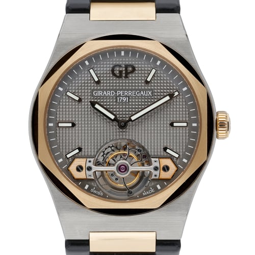 Elevate your collection with the Girard-Perregaux Laureato Tourbillon, model 99105-26231-BB6A (BQ Ref 51828). This new/unworn 2017 gents timepiece features a 45mm case crafted from lightweight titanium with 18ct rose gold accents, a plain bezel, and a grey baton dial showcasing the signature tourbillon. Powered by an automatic movement and protected by sapphire crystal, it offers 30M water resistance and is paired with a leather strap secured by a pin buckle for refined comfort. Supplied with its original box and papers, this watch is backed by a 2 Year Warranty. Enjoy Next Day Delivery and shop with confidence with our 14 Day Return Policy.