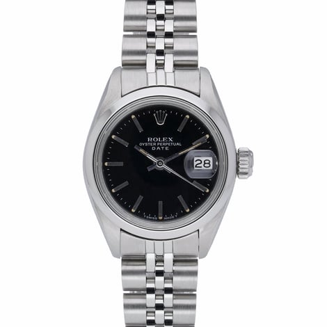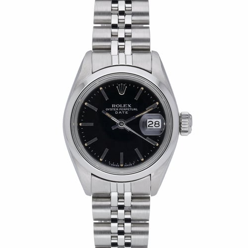 Timeless and refined, this vintage Rolex Date (ref. 6916, BQ Ref 51836) pairs a 26mm stainless steel case and domed bezel with a classic black baton dial beneath scratch-resistant sapphire crystal. The steel Jubilee bracelet and secure folding clasp enhance comfort and elegance, while tasteful diamond-set detailing adds a subtle touch of luxury. Powered by an automatic movement and water resistant to 100M, it’s a versatile everyday companion from 1979, offered in good condition. Supplied with its box, this piece includes next day delivery, a 14-day return policy, and the assurance of a 2-year warranty.