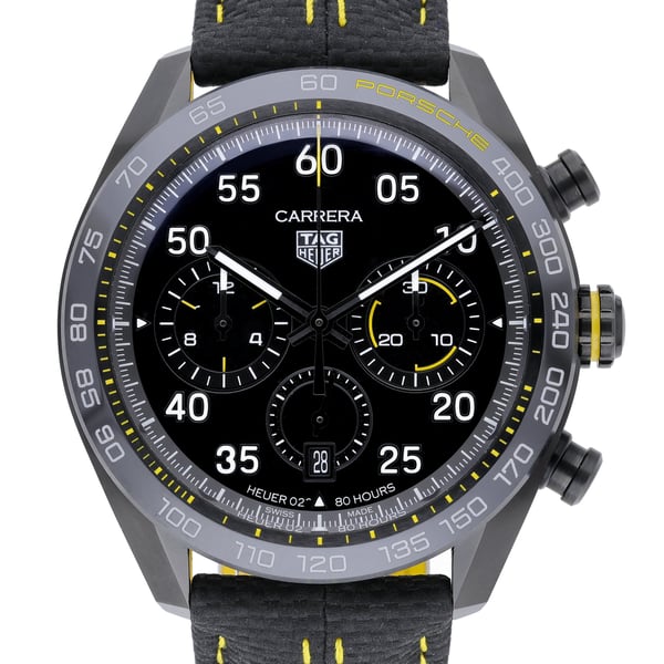 Presenting the TAG Heuer Carrera Chronograph Porsche Chronograph (Model No. CBN2A1H.FC6512), a 44mm gents’ automatic in excellent condition. Crafted in stainless steel with a tachymetric scale bezel, it features a black chronograph dial protected by sapphire crystal and is paired with a leather strap secured by a folding clasp. Water resistant to 100M, this 2023 model balances performance and refined sport style. Supplied with original box and papers, BQ Ref 51818. Includes a 5 Years Manufacturers warranty running from the 2023 date of manufacture, along with our 14 Day Return Policy. In stock for Next Day Delivery.