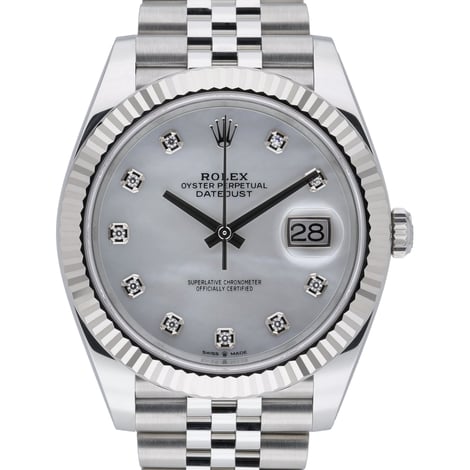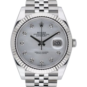 Elegant and versatile, this Rolex Datejust 41 (ref. 126334; BQ Ref 51823) pairs a 41mm steel and white gold case with a signature fluted bezel and a striking white mother-of-pearl, diamond-set dial. Crafted in 2023 and presented in excellent condition, it features an automatic movement, sapphire crystal, and 100m water resistance. The Oystersteel Jubilee bracelet with a secure folding clasp delivers lasting comfort and timeless style. Supplied complete with Rolex box, original papers, and the original white tag. Covered by a 5-year manufacturer’s warranty running from the date of manufacture, for added peace of mind. Available with next day delivery and a 14-day return policy.