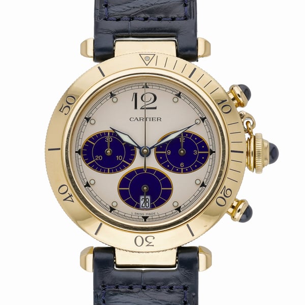A refined classic from Cartier, this gents Pasha (Model 0960 / W3003551, BQ Ref 51869) features a 38mm 18ct yellow gold case framing a cream chronograph dial beneath scratch-resistant sapphire crystal. Powered by a reliable quartz movement, it offers everyday ease with a unidirectional rotating bezel, folding clasp, and supple leather strap. Presented in excellent condition and dated to 1996, this piece balances vintage character with timeless elegance. Water resistant to 3 ATM, it is supplied with its box and includes a 2 Year Warranty for peace of mind. Enjoy our 14 Day Return Policy and Next Day Delivery for a seamless purchase experience.