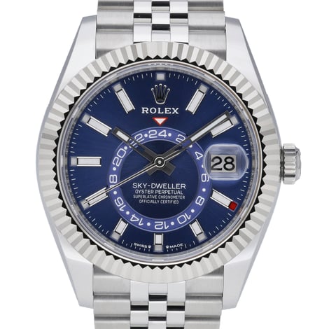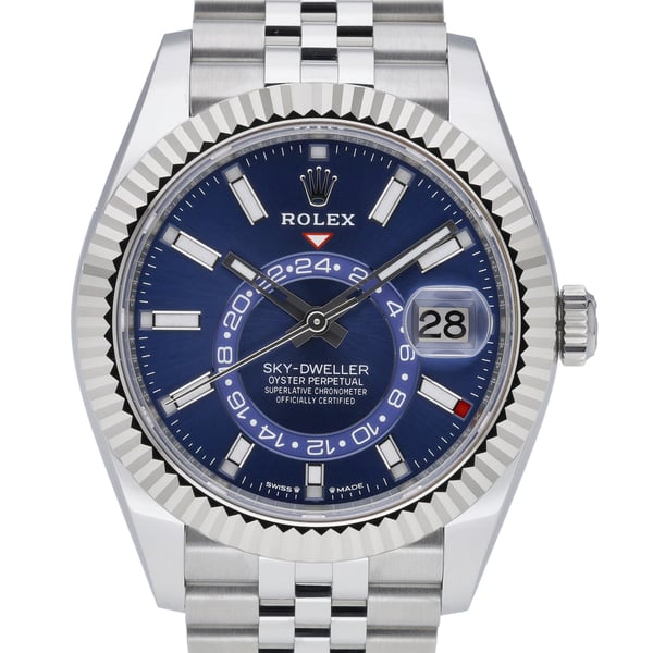 Rolex Sky-Dweller 336934 (BQ Ref 51881) in excellent condition, featuring a 42mm Steel & White Gold case with a refined fluted bezel and striking blue annual calendar dial. Powered by an automatic movement and protected by scratch-resistant sapphire crystal, this model is water resistant to 100M. It is paired with a Jubilee bracelet in Oystersteel secured by an Oysterclasp for enduring comfort and elegance. Year of manufacture: 2025. Supplied with original box, original papers, and original white tag. Covered by a 5 Years Manufacturers warranty running from the 2025 manufacture date. Next Day Delivery and a 14 Day Return Policy for complete peace of mind.