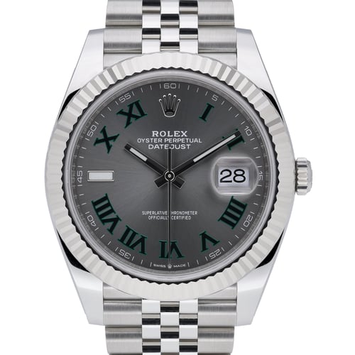 Rolex Datejust 41, ref. 126334, blending Oystersteel and 18 ct white gold with the signature fluted bezel. This 2020 gents model features a 41mm case, slate Roman dial under scratch-resistant sapphire crystal, and an automatic movement with 100M water resistance. It is presented in excellent condition on the Jubilee bracelet with a folding clasp. Supplied with Rolex box, original papers, and white tag. The manufacturer’s 5-year warranty runs from the 2020 date of manufacture. BQ Ref: 51887. Next Day Delivery available and covered by our 14 Day Return Policy.
