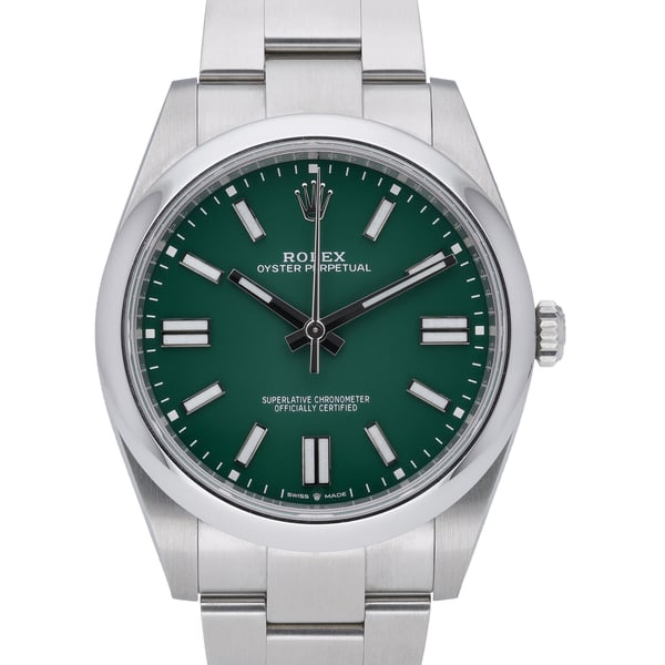 Presenting the Rolex Oyster Perpetual 41 (Model 124300), a timeless expression of Rolex design in robust Oystersteel. This 2022 gents model features a vibrant green baton dial beneath scratch-resistant sapphire crystal, a refined domed bezel, and the signature Oyster bracelet with Oysterclasp. Powered by an automatic movement and water resistant to 100M, it’s built for everyday precision and durability. In excellent condition, this watch comes complete with its original box, papers, and white tag. Covered by a 5-year manufacturer’s warranty from the 2022 date of manufacture, it offers enduring peace of mind. Case size: 41mm. BQ Ref: 51891. Enjoy next day delivery and a 14-day return policy.