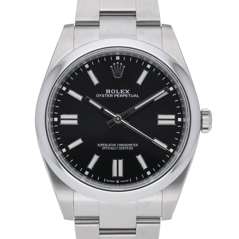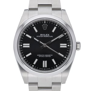 Rolex Oyster Perpetual 41 (Ref. 124300) – BQ Ref 51851. This 2021 gents’ model is in excellent condition, crafted in corrosion‑resistant Oystersteel with a sleek domed bezel and a classic black baton dial beneath scratch‑resistant sapphire crystal. Powered by a precise automatic movement, it features the robust Oyster bracelet with Oysterclasp, a versatile 41mm case, and 100M water resistance for confident daily wear. Supplied with its original Rolex box, original papers, and white tag. Covered by the Rolex 5‑year manufacturer’s warranty from the 2021 date of manufacture. Enjoy next day delivery and a 14‑day return policy. A timeless, understated Rolex essential that blends reliability, comfort, and iconic design.