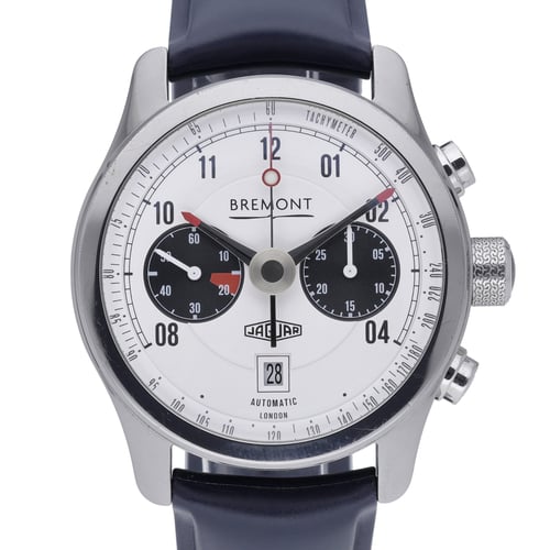 Celebrate British engineering with the Bremont Jaguar E‑Type MKII, a 43mm steel chronograph inspired by the iconic sports car. Presented in excellent condition, this 2023 example features a crisp white dial with chronograph layout, protected by scratch‑resistant sapphire crystal and framed by a smooth bezel. Powered by a reliable automatic movement and water resistant to 100M, it’s built for daily wear as well as weekend drives. The watch is fitted to a leather strap with a pin buckle for classic comfort and style. Supplied as a full set with original box and papers, it includes a 2‑Year Warranty for added peace of mind. Enjoy convenient Next Day Delivery and shop with confidence under our 14 Day Return Policy. BQ Ref: 51863.