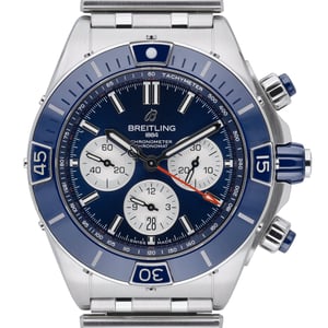 Experience the hallmark performance of the Breitling Chronomat AB0136, a 44mm steel chronograph pairing a striking blue dial with a robust steel bracelet and secure folding clasp. Powered by an automatic movement and protected by mineral glass, this 2022 example is presented in excellent condition and features a unidirectional rotatable bezel and 200M water resistance—ready for everyday wear and weekend adventure alike. Supplied with original box and papers, BQ Ref 51858, and backed by our 2 Year Warranty for confidence from day one. This gents’ model delivers crisp chronograph legibility, reassuring build quality, and the timeless versatility that has defined the Chronomat line. Enjoy convenient Next Day Delivery and shop with peace of mind under our 14 Day Return Policy.