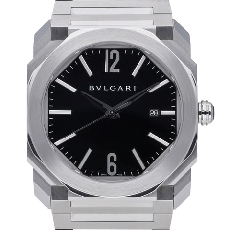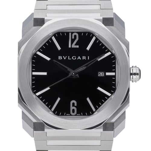 Embodying Italian design and Swiss precision, this BVLGARI Octo (Model 102031, BQ Ref 51933) features a 41mm stainless-steel case and bracelet with a plain bezel and a striking black dial with Arabic numerals, protected by sapphire crystal. Its automatic movement ensures reliable performance, while the secure folding clasp and 10 ATM water resistance make it a refined choice for daily wear. This 2014 example is in excellent condition and is supplied with its box and original papers. Enjoy peace of mind with our 2 Year Warranty and 14 Day Return Policy, plus convenient Next Day Delivery.