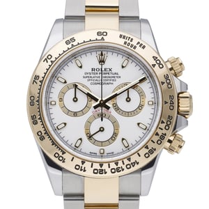 Rolex Daytona 116503 (BQ Ref 51925), 2021, in excellent condition. Crafted in steel and yellow gold with a 40mm case, white chronograph dial, and tachymetric scale bezel, this automatic timepiece pairs sport performance with refined luxury. The classic Oyster bracelet in matching steel and yellow gold features the secure Oysterlock clasp, while a scratch‑resistant sapphire crystal and 100M water resistance ensure everyday durability. Supplied as a complete set with original box, original papers, this gents Daytona offers the coveted blend of collectability and wearability. Additional details include sapphire crystal glass and an automatic movement powering its chronograph functionality. Enjoy peace of mind with a 2 Year Warranty and a 14 Day Return Policy, plus the convenience of Next Day Delivery. A standout opportunity to own an iconic Rolex chronograph in a timeless two‑tone configuration.