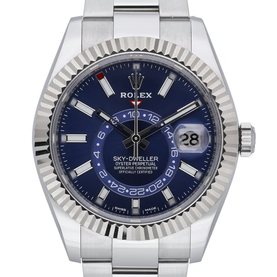 Discover the Rolex Sky-Dweller (Ref. 326934), a 42mm gents’ timepiece in Steel & White Gold presented in excellent condition. Its striking blue dial features the model’s annual calendar display, powered by a reliable automatic movement and protected by scratch-resistant sapphire crystal. The fluted white-gold bezel and Oystersteel Oyster bracelet with folding clasp deliver signature Rolex refinement and everyday comfort, while 100M water resistance adds practical versatility. This 2019 example is supplied with its original Rolex box, papers, and white tag, and is backed by our 2 Year Warranty. BQ Ref: 51918. Enjoy Next Day Delivery and a 14 Day Return Policy.