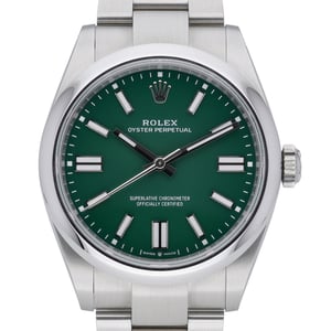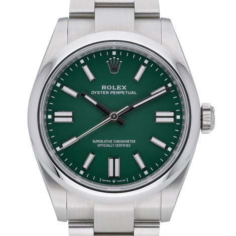 Presenting the Rolex Oyster Perpetual 41 (ref. 134300), a 2025 example in excellent condition, featuring a vibrant green baton dial framed by a smooth domed bezel. Crafted in corrosion-resistant Oystersteel with a robust Oyster bracelet and Oysterclasp, this 41mm model pairs timeless simplicity with everyday versatility. Powered by a self-winding Rolex automatic movement and protected by scratch-resistant sapphire crystal, it offers reliable performance and 100M water resistance. Supplied with its original Rolex box, papers, and white tag, this watch benefits from the 5-year manufacturer’s warranty running from the 2025 date of manufacture. BQ Ref 51910. Enjoy next day delivery and our 14-day return policy.