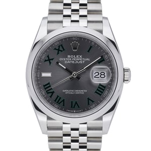 Discover the Rolex Datejust 36 “Wimbledon” (Ref. 126200, BQ Ref. 51984), a 2025 gents timepiece that blends understated luxury with everyday versatility. Its slate Roman dial nods to the Wimbledon aesthetic, framed by a smooth bezel and protected by a scratch‑resistant sapphire crystal. Crafted in robust Oystersteel, the 36mm case is paired with a classic Jubilee bracelet and secure folding clasp. Powered by an automatic movement and water resistant to 10 ATM, this New/Unworn watch is supplied with its Rolex box, original papers, and original white tag. Enjoy peace of mind with a 5-year manufacturer’s warranty from the 2025 date of manufacture, plus our 14 Day Return Policy and Next Day Delivery. A refined choice for any collection, the Datejust 36 delivers signature Rolex precision, enduring style, and exceptional wearability.