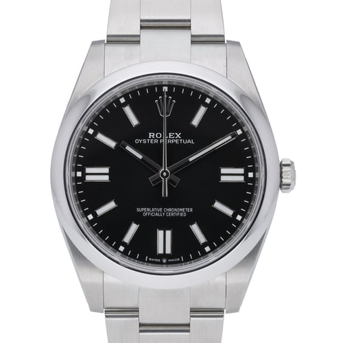 Discover the Rolex Oyster Perpetual 41 (Model 124300), BQ Ref 51973, in excellent condition. Crafted in robust Oystersteel with a 41mm case, domed bezel, and matching Oyster bracelet secured by an Oysterclasp, it pairs timeless design with everyday durability. The black baton dial sits beneath a scratch-resistant sapphire crystal, powered by an automatic movement for precise, reliable timekeeping and water resistance to 100m. Year of manufacture: 2022. Supplied with original Rolex box, original papers, and the Rolex white tag. Backed by a 5 Years Manufacturers warranty from the 2022 date of manufacture. Enjoy Next Day Delivery and a 14 Day Return Policy.