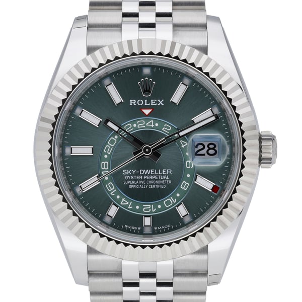 The Rolex Sky-Dweller (Ref. 336934), BQ Ref 51979, pairs Oystersteel and white gold in a 42mm case with a signature fluted bezel framing a striking green dial. Powered by an automatic movement, it delivers the Sky-Dweller’s annual calendar and dual-time functionality under scratch-resistant sapphire crystal, and is water resistant to 100M. This 2025 example is in excellent condition and is fitted with a Jubilee bracelet in Oystersteel secured by an Oysterclasp. Supplied with original Rolex box, papers, and white tag, it benefits from a 5-year manufacturer’s warranty running from the 2025 date of manufacture. Gents model. Next Day Delivery available and backed by our 14 Day Return Policy.