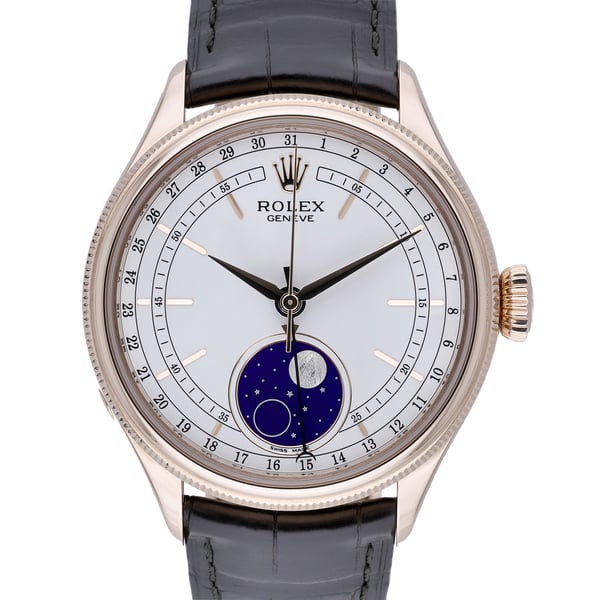 The Rolex Cellini Moonphase (Model 50535) blends timeless elegance with refined craftsmanship. Housed in a 39mm 18ct rose gold case with a smooth bezel, it features a pristine white moonphase dial protected by sapphire crystal and powered by an automatic movement. The watch is presented on a leather strap with a deployment clasp and offers 50M water resistance. Manufactured in 2023 and in excellent condition, this piece is supplied with its Rolex box, original papers, and original white tag. Backed by a 2 Year Warranty, it is available with Next Day Delivery and a 14 Day Return Policy. BQ Ref: 51988.