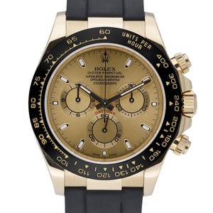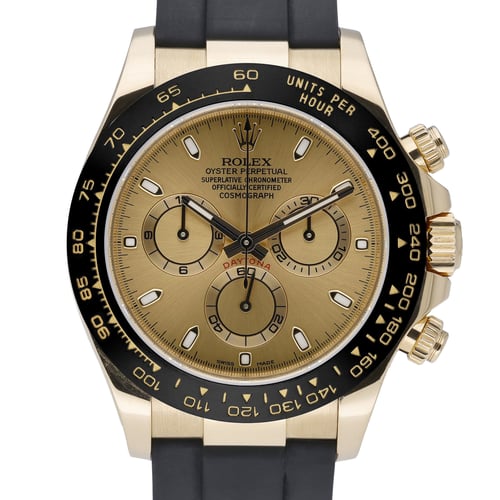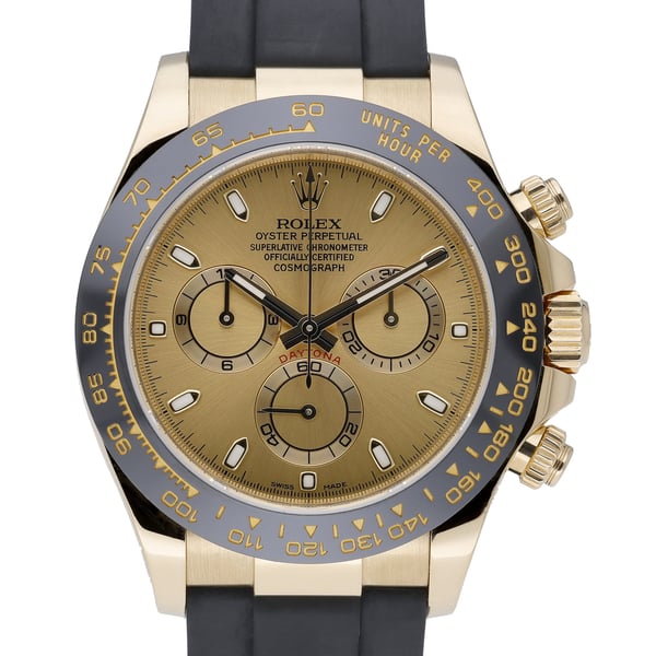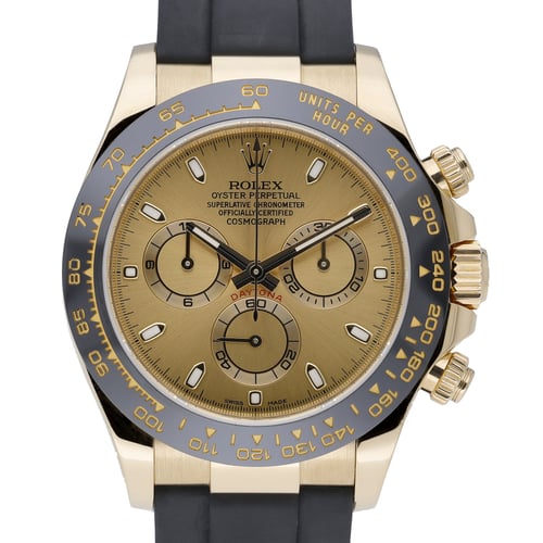Experience the iconic chronograph from Rolex with this Daytona, reference 116518LN. Crafted in 18ct Yellow Gold with a 40mm case, it features a tachymetric scale bezel and a champagne chronograph dial protected by sapphire crystal. The automatic movement is paired with a sporty yet refined Oysterflex rubber bracelet and secure Oysterlock clasp, offering 100m water resistance for dependable performance. Dated 2018 and presented in excellent condition, this gents model is supplied with its box and white tag. Manufacturer’s 5-year warranty runs from the date of manufacture. Enjoy Next Day Delivery and our 14 Day Return Policy. BQ Ref: 52005.