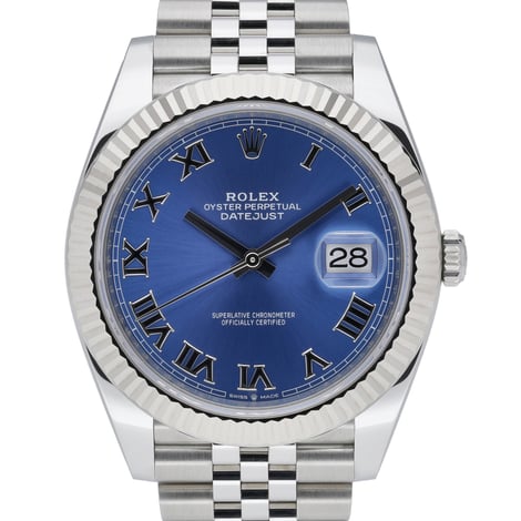Rolex Datejust 41 (126334), 2021, presented in excellent condition. The 41mm case combines Oystersteel with 18 ct white gold and a signature fluted bezel, framing a striking blue Roman dial beneath scratch-resistant sapphire crystal. Powered by a reliable automatic movement and paired with the refined Jubilee bracelet in Oystersteel with a secure folding clasp, this classic offers everyday elegance and performance, with water resistance to 100m. Supplied as a full set with original box, papers, and white tag. BQ Ref: 52008. Enjoy added confidence with our 2 Year Warranty, 14 Day Return Policy, and Next Day Delivery.