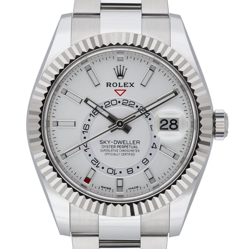 Discover the Rolex Sky-Dweller 326934, a 42mm statement in steel and white gold with a crisp white annual-calendar dial. Powered by an automatic movement and protected by sapphire crystal, this 2021 example is in excellent condition. The iconic fluted bezel frames the display, while the robust Oystersteel Oyster bracelet with folding clasp ensures enduring comfort and security. Water resistant to 100m, this reference arrives complete with Rolex box, original papers, and white tag. Supplied with a 2 Year Warranty, plus a 14 Day Return Policy and Next Day Delivery. Model: Sky-Dweller | Brand: Rolex | BQ Ref: 52035.