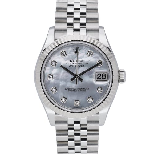 Rolex Datejust 31 (ref. 278274) — a new/unworn 2025 example in Oystersteel and white gold with a signature fluted bezel. The 31mm midsize case houses an automatic movement protected by sapphire crystal and offers 100m water resistance. Its lustrous mother-of-pearl dial is set with diamond hour markers, complemented by a five-link Jubilee bracelet in Oystersteel with a concealed clasp for a seamless finish. Supplied complete with original Rolex box, white tag, and papers, and backed by a 5-year manufacturer’s warranty from the 2025 date of manufacture. Next Day Delivery available and covered by our 14 Day Return Policy. BQ Ref: 52013.