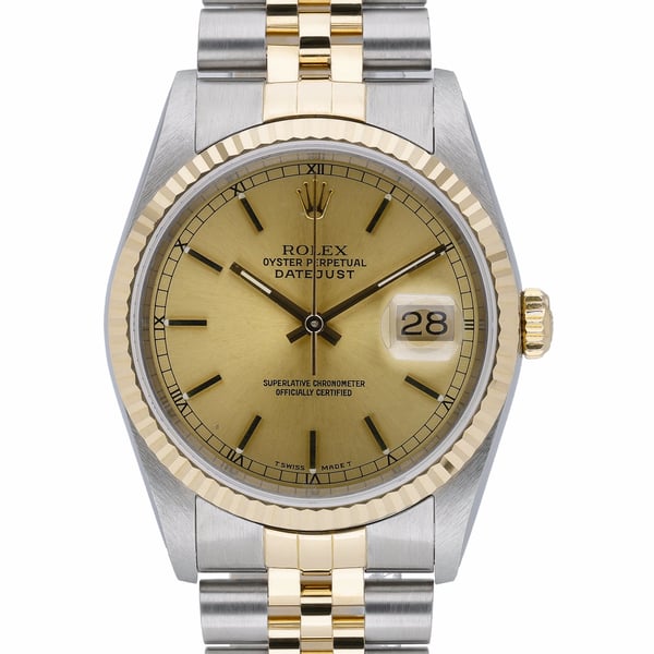 Celebrate timeless elegance with this Rolex Datejust ref. 16233 (BQ Ref 52020), a 36mm two-tone timepiece crafted in steel and yellow gold. It features a fluted yellow gold bezel framing a champagne baton dial beneath scratch-resistant sapphire crystal. Powered by a reliable automatic movement, this 1988 example is presented in excellent condition and paired with the iconic Jubilee bracelet with a secure folding clasp. Water resistant to 10 ATM, it is ideal for everyday sophistication. Supplied with original box, papers, and green tag, and backed by our 2 Year Warranty for peace of mind. Enjoy next day delivery and a 14 day return policy.