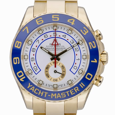 Rolex Yacht-Master II ref. 116688 (BQ Ref 52012) in 18ct yellow gold, presented in excellent condition. The 44mm case and solid Oyster bracelet with Oysterlock clasp frame a crisp white dial with chronograph functionality, protected by sapphire crystal. A bidirectional rotatable bezel and reliable automatic movement deliver the precision and control expected from this nautical icon. Water resistant to 100M, this 2008 gents model is supplied with its box and original green tag. Manufacturer’s 5-year warranty counted from the date of manufacture. Enjoy confidence with our 14-day return policy and next day delivery.