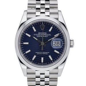 Elevate your collection with this Rolex Datejust 36 (ref. 126200), manufactured in 2022. The 36mm Oystersteel case showcases a striking blue baton dial beneath sapphire crystal, complemented by a smooth bezel and the iconic Jubilee bracelet with a secure folding clasp. Powered by an automatic movement and water resistant to 10 ATM, it delivers everyday reliability with timeless refinement. Presented in excellent condition and supplied with original box and papers. BQ Ref: 52031. Enjoy peace of mind with our 2 Year Warranty, plus a 14 Day Return Policy and Next Day Delivery.