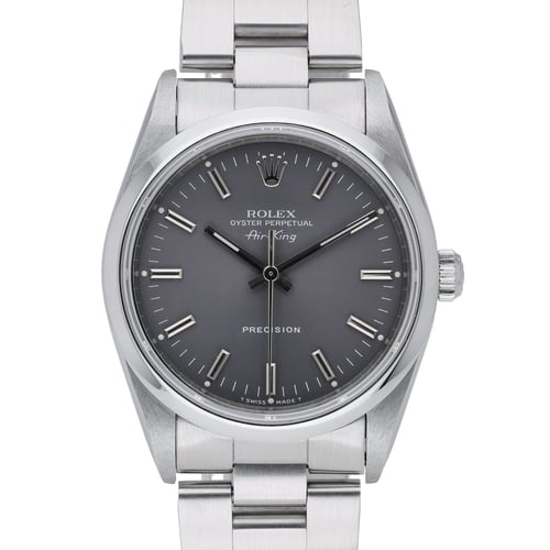 Rolex Air-King 14000 (1993) in excellent condition, featuring a 34mm Oystersteel case with smooth bezel and a grey baton dial beneath scratch-resistant sapphire crystal. Powered by a reliable automatic movement, it wears on a robust Oystersteel Oyster bracelet secured with an Oyster clasp. Water resistant to 100M, this timeless gents’ Rolex delivers understated style and everyday versatility. Supplied with original Rolex box and papers, BQ Ref 52060. Covered by a 2 Year Warranty with 14 Day Return Policy and Next Day Delivery.