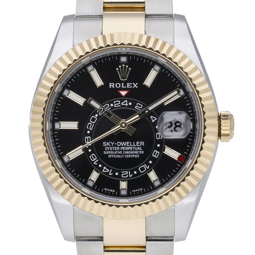 Experience the Rolex Sky-Dweller 326933, a 42mm masterpiece in steel and yellow gold that blends elegance with practical sophistication. Presented in excellent condition from 2021, it features an automatic movement, a sleek black dial with an annual calendar and dual-time functionality, and Rolex’s signature fluted bezel. The Oyster bracelet with Oysterclasp ensures a secure, comfortable fit, while the sapphire crystal and 100M water resistance offer robust everyday reliability. Supplied with its original box and papers (BQ Ref 52087) and backed by our 2 Year Warranty. Next Day Delivery available with a 14 Day Return Policy.
