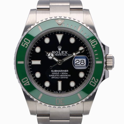 Rolex Submariner 126610LV “Starbucks” (2020) in excellent condition, featuring a 41mm Oystersteel case, black dial beneath scratch-resistant sapphire crystal, and a unidirectional rotatable bezel for precise timing. Powered by an automatic movement with 300M water resistance, it’s fitted to the robust Oystersteel Oyster bracelet with secure Oysterlock clasp. This complete set includes the Rolex box, original papers, and original white tag. BQ Ref: 52098. Covered by our 2 Year Warranty, with a 14 Day Return Policy for peace of mind, and available with Next Day Delivery. A modern icon that blends Rolex’s dive-watch heritage with contemporary refinement.