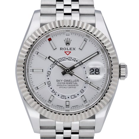 Presenting the Rolex Sky-Dweller ref. 326934 (BQ Ref 52078), a 42mm masterpiece in Steel & White Gold with the signature fluted bezel. The crisp white dial features the Sky-Dweller’s annual calendar display, driven by a robust automatic movement and protected by sapphire crystal. It is paired with a Steel & White Gold Jubilee bracelet and secure folding clasp, and offers water resistance to 100m. Manufactured in 2023 and in excellent condition, this example is complete with its original box and papers. Supplied with next day delivery and a 14-day return policy. Covered by a 5-year manufacturer’s warranty from the 2023 date of manufacture.