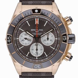 Commanding and refined, this Breitling Super Chronomat B01 44 (RB0136) pairs robust performance with luxurious detail. Its 44mm 18ct rose gold case frames a brown chronograph dial protected by sapphire crystal, complemented by a unidirectional rotating bezel for confident, precise timing. The automatic movement delivers reliable, everyday accuracy, while 200M water resistance enhances versatility. A rubber strap with folding clasp ensures secure, comfortable wear. Presented in excellent condition, this 2021 example is supplied with its original box and papers. Benefit from a 2 Year Warranty, Next Day Delivery, and a 14 Day Return Policy. BQ Ref: 52077.