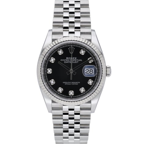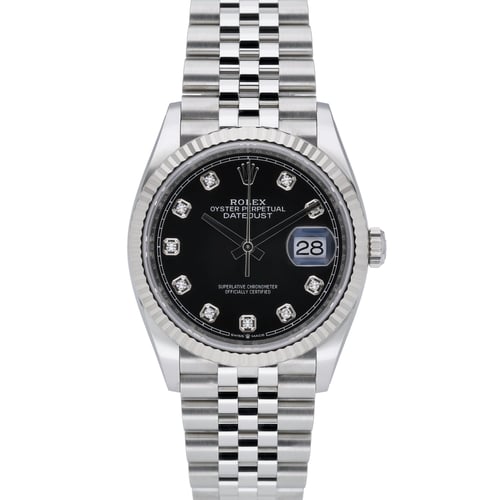 Presenting the Rolex Datejust 36 (Model 126234), a 36mm gents’ classic in steel and white gold with a signature fluted bezel. This unworn 2020 example (with stickers) pairs a black diamond-set dial with scratch-resistant sapphire crystal and a reliable automatic movement. The Jubilee bracelet in Oystersteel with a folding clasp offers comfort and enduring elegance, while 100M water resistance ensures everyday versatility. Supplied with its Rolex box, original papers, and white tag. Covered by a 5-year manufacturer’s warranty from its 2020 date of manufacture. BQ Ref 52126. Next day delivery available with a 14-day return policy.