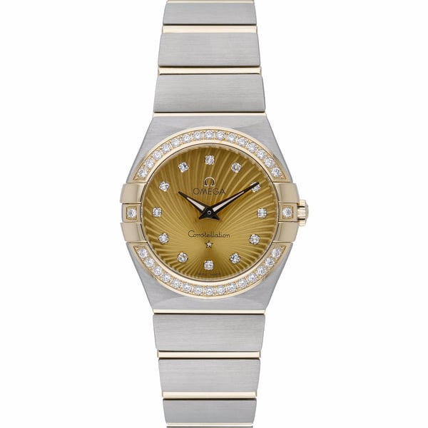 Elegant and iconic, this ladies’ Omega Constellation (Model 131.25.28.60.58.001, BQ Ref 52115) features a 28mm steel and yellow gold case with a diamond bezel and diamond-set champagne dial. Powered by a precise quartz movement and protected by scratch‑resistant sapphire crystal, it blends luxury with everyday practicality, including 50M water resistance and a secure folding clasp on the matching steel and yellow gold bracelet. Presented in excellent condition, it is supplied with box and supported by our 2 Year Warranty, 14 Day Return Policy, and Next Day Delivery. A refined choice for those who appreciate timeless design and shimmering detail.