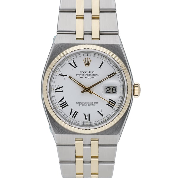 Rolex Datejust Oysterquartz ref. 17013 (BQ Ref 52118), 36mm, crafted in steel and yellow gold from 1983 and presented in excellent condition. This distinguished example features a fluted bezel, a white Roman dial protected by sapphire crystal, and Rolex’s precise quartz movement for effortless accuracy. The integrated steel and yellow gold bracelet with Oysterclasp offers a crisp, timeless profile, while 10 ATM water resistance ensures everyday versatility. Supplied with its original Rolex box and papers, plus service stickers, it combines collectible provenance with ready-to-wear appeal. Includes our 2 Year Warranty, Next Day Delivery, and a 14 Day Return Policy.