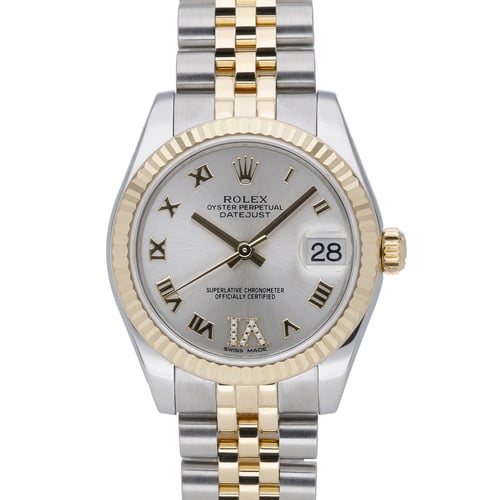 Rolex Datejust 31 (Model 178273, BQ Ref 52141) in excellent condition. This 2016 midsize showcases a 31mm steel and yellow gold case with a classic fluted bezel and a Jubilee bracelet secured by a concealed clasp. The silver Roman dial sits beneath sapphire crystal, while the automatic movement delivers dependable performance and 100M water resistance for everyday versatility. Supplied with original box, papers and green tag, and backed by a 2 Year Warranty. Enjoy Next Day Delivery and a 14 Day Return Policy for complete peace of mind.