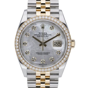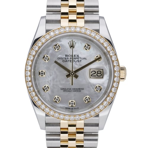 Rolex Datejust 36 ref. 126283RBR (BQ Ref 52128), 2021. Presented in steel and yellow gold with a Jubilee bracelet and folding clasp, this 36mm Datejust pairs a diamond‑set bezel with a white mother‑of‑pearl dial featuring diamond hour markers, all beneath scratch‑resistant sapphire crystal. Powered by an automatic movement and water resistant to 100m, it is offered in excellent condition. Supplied with original box and papers, plus our 2‑Year Warranty, 14‑Day Return Policy, and Next Day Delivery. A timeless, diamond‑set Rolesor classic ready to wear.
