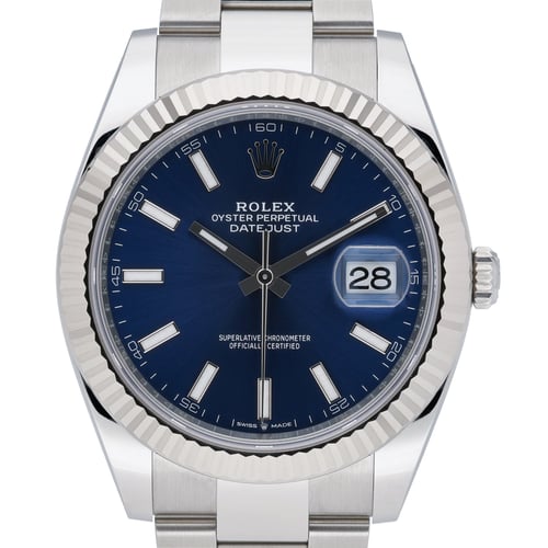 Rolex Datejust 41 (ref. 126334) in excellent condition, pairing Oystersteel with an 18 ct white gold fluted bezel for timeless elegance. This 41mm model showcases a striking blue baton dial protected by scratch-resistant sapphire crystal, and is powered by a precise automatic movement with 100m water resistance. Supplied as a full set with Rolex box, original papers, and white tag, and fitted to the robust Oyster bracelet with a secure folding clasp. Year of manufacture: 2025. Includes a 5-year manufacturer’s warranty from the date of manufacture. BQ Ref 52142. Next day delivery available and a 14-day return policy for added peace of mind.
