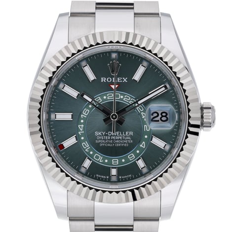 Rolex Sky-Dweller 336934, a 42mm blend of Oystersteel and 18 ct white gold with Rolex’s signature fluted bezel and a striking green annual calendar dial featuring dual time functionality. This 2025 example is in excellent condition, powered by an automatic movement and protected by sapphire crystal, with 100M water resistance for confident daily wear. It comes fitted to the robust Oyster bracelet with Oysterclasp for secure comfort. Supplied with original box, papers, and white tag; BQ Ref 52112. Covered by Rolex’s 5-year manufacturer’s warranty from its 2025 date of manufacture. Next day delivery and a 14-day return policy for your peace of mind.