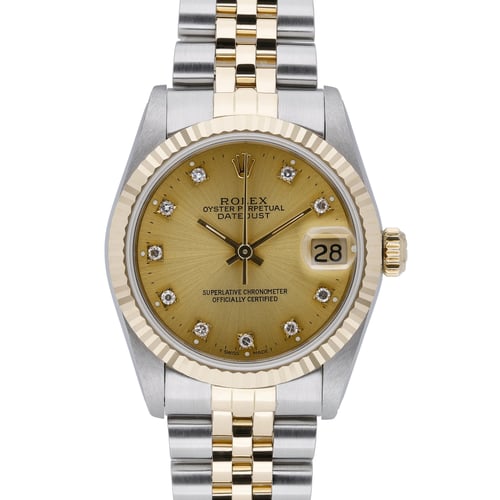 This midsize 31mm Rolex Datejust (ref. 68273, BQ Ref 52122) blends steel and 18k yellow gold with a classic fluted bezel and Jubilee bracelet for an enduring two-tone aesthetic. The champagne diamond-set dial, protected by sapphire crystal, is driven by a dependable automatic movement. Produced in 1988 and presented in excellent condition, it offers everyday versatility with 100M water resistance and a secure folding clasp. Supplied with its original box and papers, this elegant Datejust is backed by a 2 Year Warranty for added confidence. Enjoy Next Day Delivery and a 14 Day Return Policy.