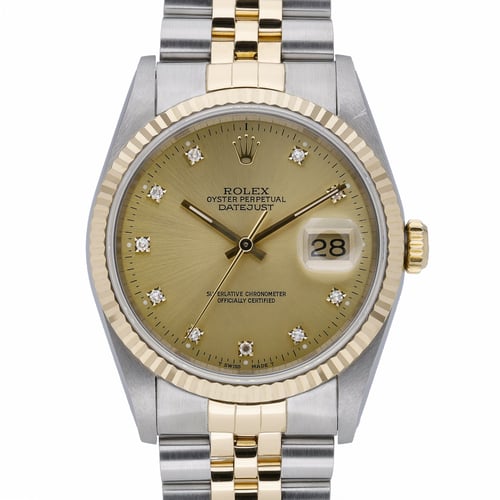 Iconic and timeless, this Rolex Datejust ref. 16233 (1991) pairs stainless steel and yellow gold in a classic 36mm case with a fluted bezel and Jubilee bracelet. Presented in excellent condition, it features an automatic movement and a champagne diamond-set dial beneath a scratch-resistant sapphire crystal, with water resistance to 10 ATM. Secured by a folding clasp, it delivers refined comfort and everyday versatility. Supplied with its original box, papers, and green tag, this piece exemplifies Rolex craftsmanship and enduring style. Backed by a 2-year warranty and a 14-day return policy, with next day delivery available, BQ Ref 52172 is an exceptional choice for collectors and discerning wearers alike.