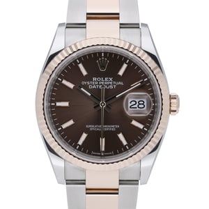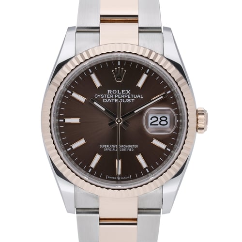 Elegant and versatile, this 2025 Rolex Datejust 36 (ref. 126231) pairs steel and rose gold with a fluted bezel and chocolate baton dial. Presented in excellent condition, it features a reliable automatic movement, a 36mm case with scratch-resistant sapphire crystal, and 100m water resistance. The classic Oyster bracelet with Oysterclasp ensures comfort and security. Supplied as a complete set with Rolex box, original papers, and original white tag; BQ Ref 52221. Covered by the Rolex five-year manufacturer’s warranty from its 2025 date of manufacture, offering peace of mind through to 2030. Next day delivery available with a 14-day return policy.