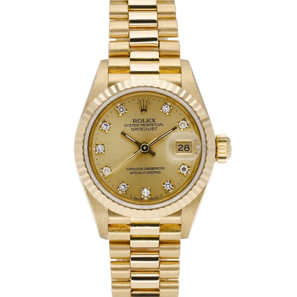 Timeless and elegant, this ladies’ Rolex Datejust (Model 69178, BQ Ref 52203) features a 26mm 18ct Yellow Gold case with a fluted bezel and matching President bracelet with concealed clasp. Its champagne diamond-set dial offers refined brilliance beneath a durable sapphire crystal. Powered by an automatic movement and water resistant to 100M, this 1993 example is presented in excellent condition. Supplied with its Rolex box and original papers, it comes with a 2 Year Warranty, a 14 Day Return Policy, and Next Day Delivery for a seamless purchase experience.