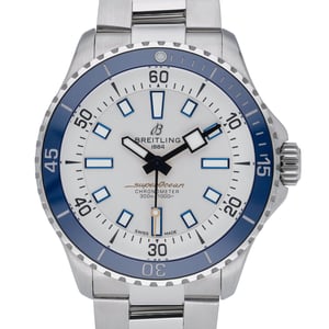 The Breitling Superocean 42 (model A17375) pairs professional dive capability with refined everyday style. Its 42mm stainless-steel case and matching bracelet with folding clasp frame a crisp white dial under scratch-resistant sapphire crystal, while a unidirectional rotatable bezel and 300M water resistance underscore its purpose-built design. Powered by an automatic movement, this 2023 example is in excellent condition and is supplied with its original box and papers; protective stickers are present. Backed by a 2-year warranty, it also benefits from our 14-day return policy and next day delivery for a seamless purchase experience. BQ Ref: 52264.