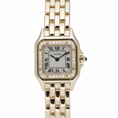 Iconic and irresistibly elegant, this Cartier Panthère (Model 1070) pairs timeless design with luxurious detail. Crafted in 18ct yellow gold, its 22mm x 30mm case and fluid bracelet are complemented by a diamond-set bezel that frames a white Roman dial with blued-steel hands. A sapphire crystal protects the face, while a precise quartz movement ensures effortless reliability. Presented in good condition and dating to 1998, this ladies’ timepiece features a secure folding clasp and 3 ATM water resistance for everyday confidence. Supplied with Cartier box and original papers, plus a 2 Year Warranty for peace of mind. BQ Ref: 52299. Next Day Delivery available and a 14 Day Return Policy.