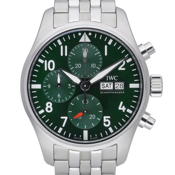 Experience cockpit-inspired precision with the IWC Pilot Chronograph IW388104, a 41mm gents’ timepiece crafted in stainless steel and paired with a robust steel bracelet and secure folding clasp. Its striking green chronograph dial features bold Arabic numerals and clear subdials, protected by scratch-resistant sapphire crystal and framed by a clean, plain bezel. Powered by a reliable automatic movement and water-resistant to 10 ATM, this 2025 model blends everyday functionality with signature IWC refinement. In excellent condition, it is supplied with its box and original papers, and is backed by a 2-Year Warranty. Enjoy added peace of mind with our 14 Day Return Policy and the convenience of Next Day Delivery. Model: Pilot Chronograph | Ref: IW388104 | BQ Ref: 52289.